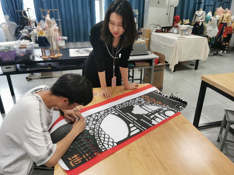 带领社团学生制作非遗剪纸献礼百年华诞。