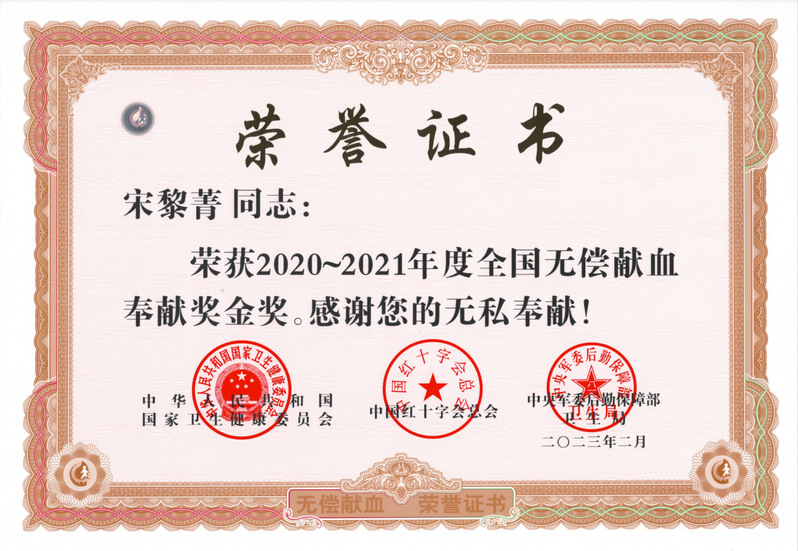 近日,我校机电学院宋黎菁老师受到中华人民共和国国家卫生健康委员会、中国红十字总会、中央军委后勤保障部卫生局部门联合表彰,荣获 “2020-2021年度全国无偿献血奉献奖金奖”,这是继2021年来再获殊荣。2020-2021年度共无偿献血33次,成分血66治疗量,折合13200毫升献血量,两年度无偿献血量在常州市排名第2。