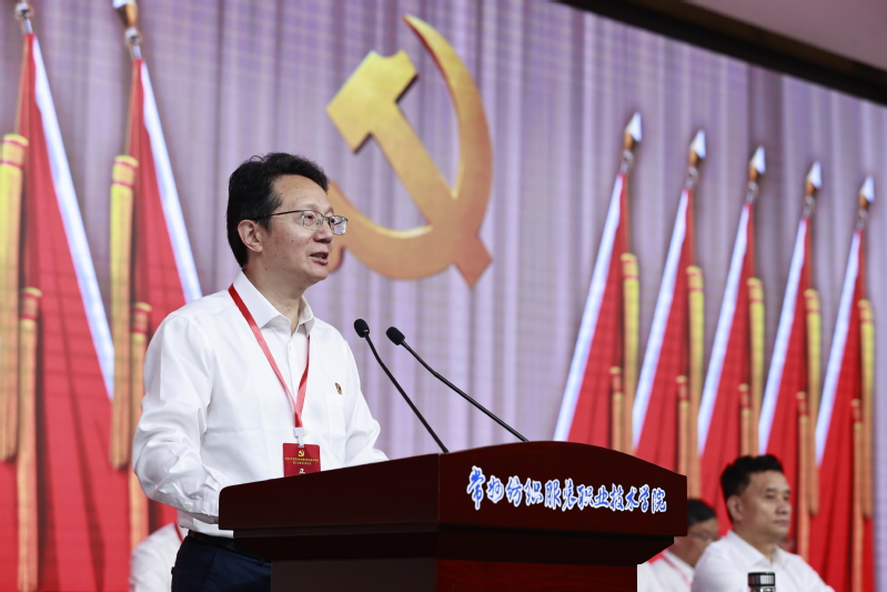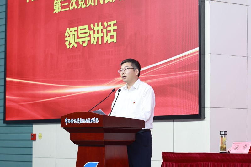 胡泊代表中共常州市委组织部对大会的召开表示热烈祝贺。他指出,学校特色鲜明,坚持“进德、立业、敏学、笃行”为校训,以立德树人为根本使命,在60余年的建校历程中,积累了深厚的教学经验,办学成效显著,社会认可度高,在同类学校中发挥着较强的辐射和示范作用。近年来,学校以创建“现代化、国际化、智慧型、创业型”的高水平高职学校为目标,大力推进职业教育改革创新和产教深度融合,先后被评为江苏省中国特色高水平高职学校建设单位、全国纺织服装教育先进单位、全国高职高专创新创业教育工作先进单位等,并连续多年获评全国纺织行业党建工作先进单位、“江苏高校毕业生就业工作量化督导A等高校”。这些成绩的取得,是学校领导班子带领全体教职员工团结拼搏、奋发进取的结果。他希望学校以第三次党代会为契机,坚持正确方向,把党的领导一贯到底;坚持强基固本,把组织建设一抓到底;围绕中心工作,把发展蓝图一干到底。他祝愿常州纺院以本次大会召开为新的起点,在新一届党委的带领下,接续奋斗、再创辉煌,推动习近平新时代中国特色社会主义思想在常纺院落地生根、见行见效。