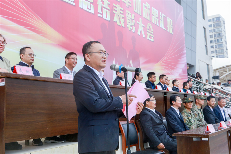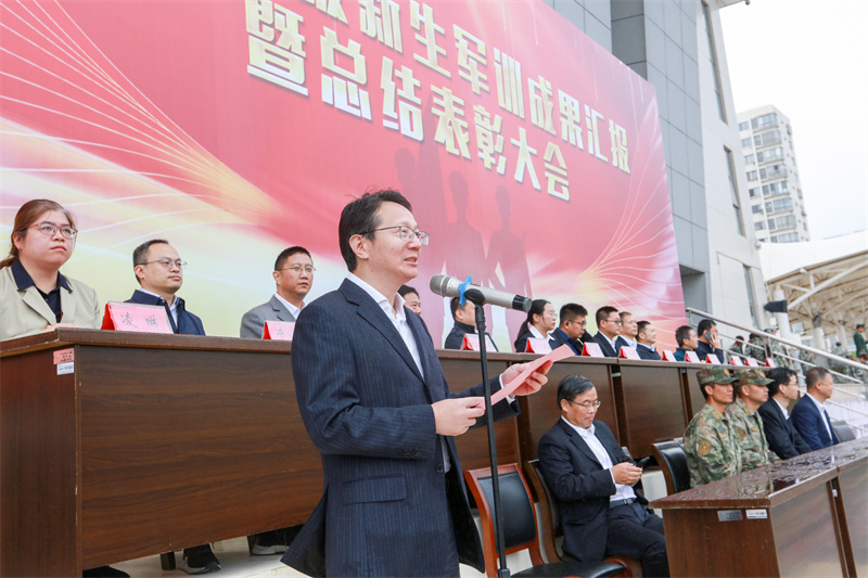 最后,洪霄作总结讲话。他首先对承训部队官兵的辛勤付出表示衷心的感谢,并对全体新生在军训中的优异表现给予了高度评价。他强调,军训不仅是一次身体上的锻炼,更是一次心灵上的洗礼。通过军训,同学们从中学会了自律、坚持和不轻言放弃的品质,这些将伴随他们走过大学三年乃至整个人生旅程。他希望同学们能够将军训中学到的宝贵品质带入到今后的学习和生活中去,带着军训中学到的精神,勇敢地迎接未来的挑战,书写属于自己的精彩篇章。