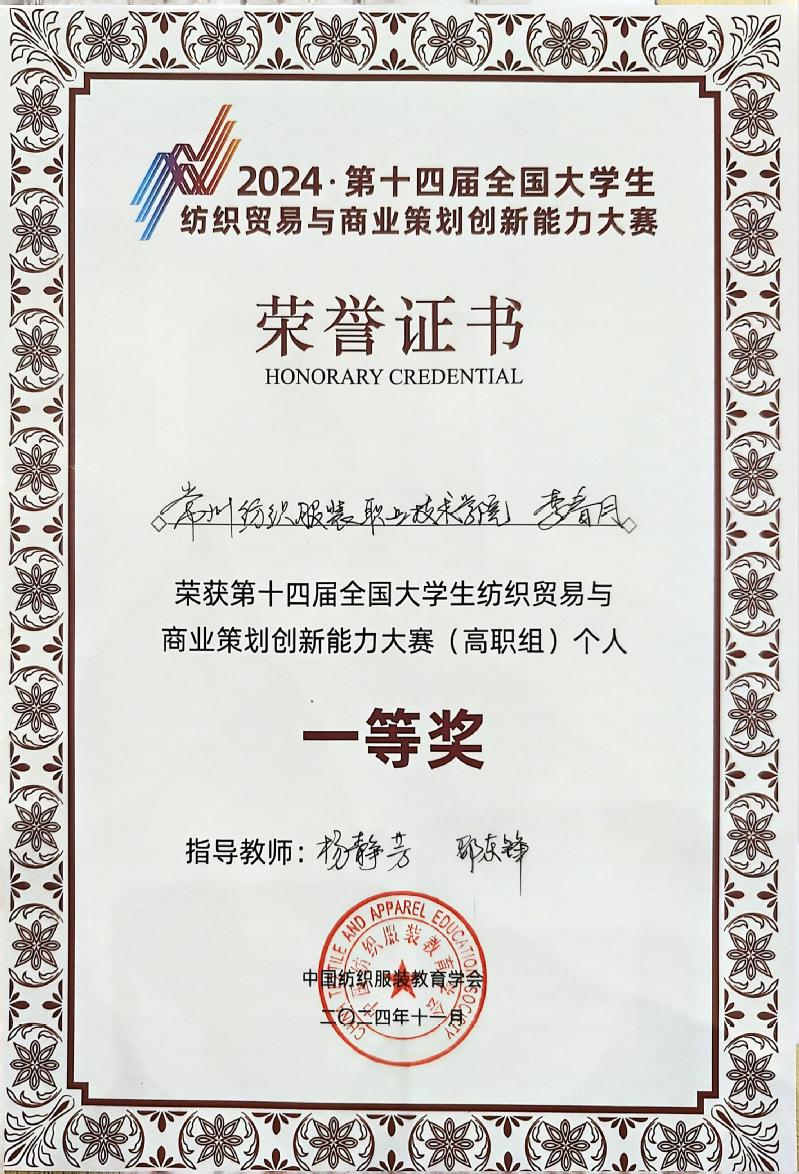 2024年11月1日至3日,第十四届全国大学生纺织贸易与商业策划创新能力大赛在盐城工业职业技术学院落下帷幕,智能纺织与材料学院邵东锋、杨静芳团队指导的学生团队凭借扎实的技能和过硬的个人素质,取得了优异成绩。