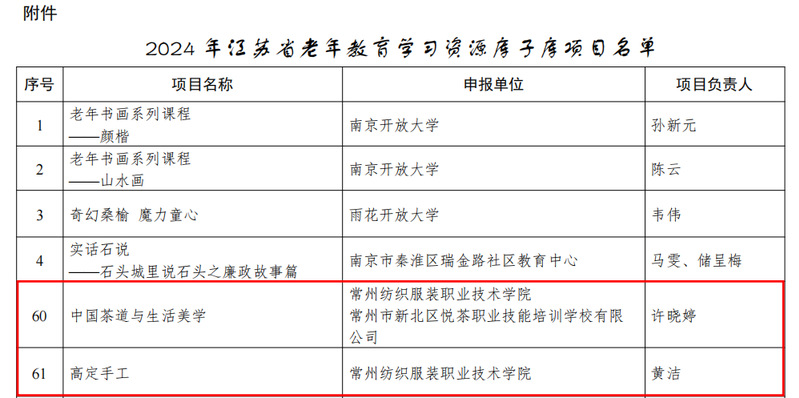 近日,江苏省教育厅公布了2024年省级老年教育学习资源库子库项目认定结果,全省共有64家单位的90个项目脱颖而出,成功上榜。我校再次传来喜讯,创意学院许晓婷、徐静、许婷芳老师携手打造的《中国茶道与生活美学》课程,服装学院黄洁老师主持的《高定手工》课程,双双入选省级老年教育学习资源库子库。这两门特色课程不仅直接入库,还将在“江苏学习在线”与“江苏老年教育”两大学习平台上公开共享,为老年学习者提供丰富的学习资源。这是我校连续两年报送两门课程全部入选并获此殊荣。