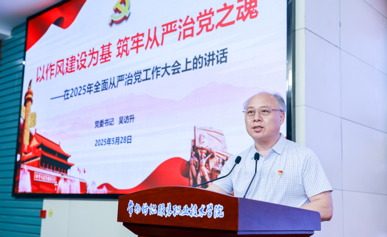 党委书记吴访升作了题为《以作风建设为基 筑牢从严治党之魂》的全面从严治党工作报告。他对2024年全面从严治党做了简要回顾,从强化政治引领、组织建设、纪律建设、作风建设、政治安全等五个方面对学校2025年全面从严治党重点任务作了部署安排。从明确目标任务,推动全面从严治党走深走实;服务中心大局,着力推进“赋能基层发展年”;聚焦服务主阵地,优化作风建设促效能提升三个方面谈了落实工作的几点要求。希望以此次会议为新的起点,持续深化全面从严治党,不断增强党组织的凝聚力和战斗力,推动学校党的建设和全面从严治党工作取得新的更大成效。