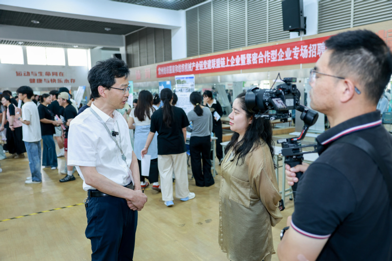 王顺明深入招聘会现场,了解用人单位岗位需求和毕业生就业意向,并接受了常州电视台的采访,介绍了本次招聘会是常州纺织服装和纺织机械产业链党委年度重点任务之一,更是落实中央和江苏省就业工作决策部署的有效举措,通过党建引领搭平台,集聚资源优势,实现教育链、人才链和产业链的精准对接,推动毕业生充分、精准就业。