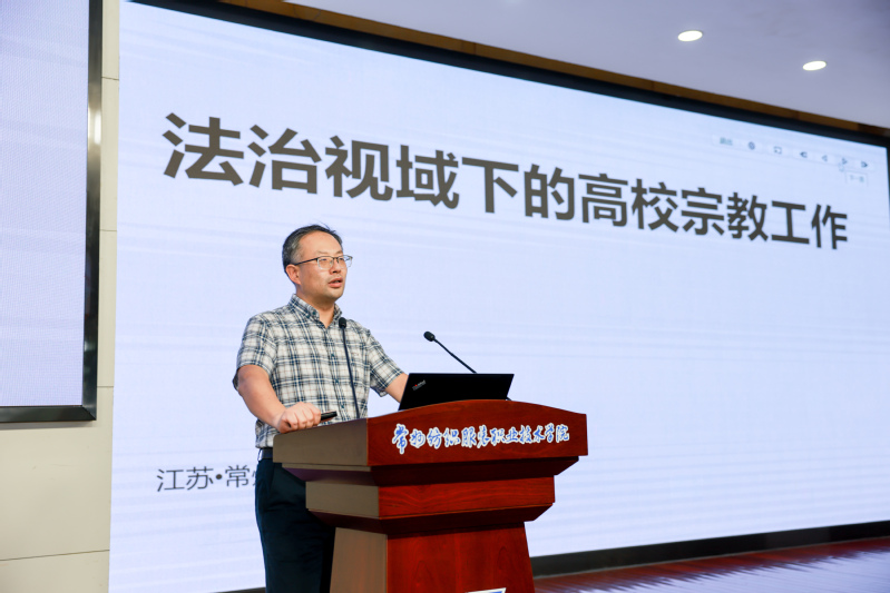 本次培训特邀江苏省民宗委政策法规处朱万青作专题辅导。他以“法治视域下的高校宗教工作”为主题,结合高校实际案例,系统阐释了新时代做好高校宗教工作的重要意义、主要任务与实践路径。朱万青指出,高校作为人才培养和思想文化引领的重要阵地,必须高度重视民族宗教工作,切实维护校园和谐稳定,落实立德树人根本任务。他强调,高校要在思想政治理论课中突出马克思主义宗教观的教育内容,坚持将马克思主义的“魂脉”和中华优秀传统文化的“根脉”相结合,全面系统加强中华民族共同体理论体系建设,不断夯实铸牢中华民族共同体意识的思想根基。